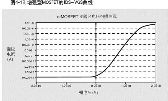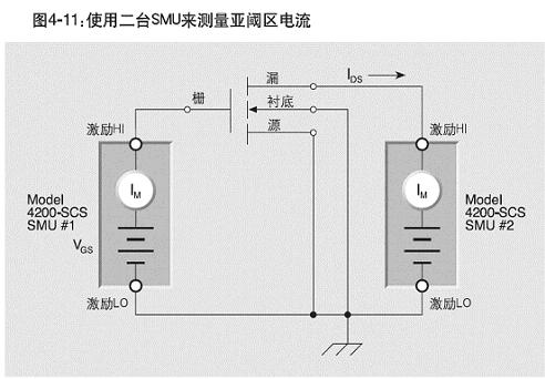亞閾區(qū)電流測(cè)試常常在晶圓片級(jí)進(jìn)行。它是表示器件打開(kāi)和關(guān)閉的快慢程度的參數(shù)。圖4-11示出測(cè)量亞閾區(qū)電流的典型測(cè)試設(shè)置情況。在此配置中,4200型半導(dǎo)體特性分析系統(tǒng)配備了2個(gè)SMU和前置放大器。使用一個(gè)SMU來(lái)提供恒定的漏-源電壓(VDS),并測(cè)量產(chǎn)生的漏極電流(IDS)。另一個(gè)SMU用來(lái)掃描柵-源電壓(VGS)。對(duì)這個(gè)SMU來(lái)說(shuō),應(yīng)當(dāng)將鉗位電流或測(cè)量電流值設(shè)置為固定測(cè)量量程上的最高期望的柵極電流。