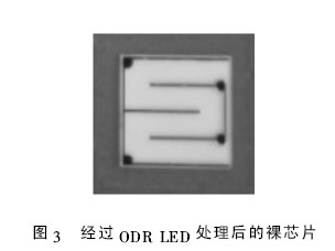 本批實(shí)驗樣品采用揚(yáng)州華夏集成光電有限公司生產(chǎn)的芯片.對一塊外延片整體進(jìn)行測試,發(fā)現(xiàn)測試結(jié)果基本一致后試制成芯片. 將該外延片一半制做成普通LED 芯片,另一半制做ODR LED 芯片,芯片的尺寸為40 mil. 選取一個單元中的ODR LED芯片如圖3 所示,與圖2 比較,可以明顯看出芯片亮度不同.