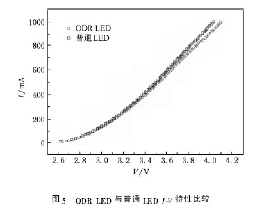 由兩種LED 曲線的解析( 4) ,( 5) 式也可以看出兩種LED 的電壓差差距較小,說明ODR LED 處理對LED 器件電壓基本無影響.