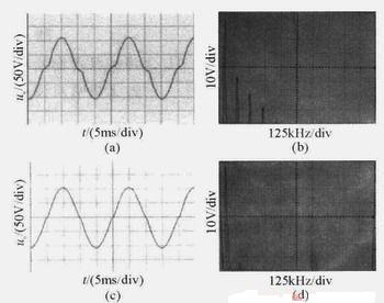 在實驗中,開關(guān)頻率為10kHz,正弦波頻率為50Hz,取L1=1.15mH,L2=0.1mH,C=90μF,負(fù)載為純阻性,滿載時為8歐姆,死區(qū)時間Td設(shè)置為2μs。