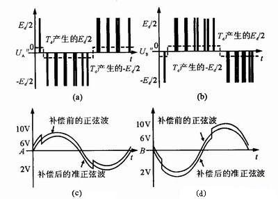 在死區(qū)時間內(nèi),由于續(xù)流的緣故輸出電壓波形發(fā)生了畸變,通過對波形進行等效的補償可以得到準(zhǔn)正弦波。推理和實驗均證明該方法能較好地對逆變器橋路輸出電壓進行補償。該方法簡單實用,易于實現(xiàn),具有一定的工程使用價值。
