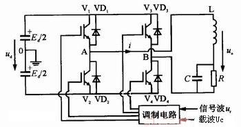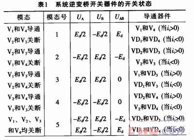 在采用IGBT作為開關(guān)器件的單相橋式PWM逆變電路中,假設(shè)負(fù)載為阻感負(fù)載。工作時V1和V2的通斷狀態(tài)互補,V3和V4的通斷狀態(tài)也互補。逆變橋的主回路由左右橋臂組成,每個橋臂有兩個IGBT,每一個開關(guān)器件都有一個PWM波控制其導(dǎo)通,且同一橋臂上的兩功率開關(guān)器件不能同時導(dǎo)通,否則會導(dǎo)致直流電壓短路??紤]到在感性負(fù)載下二極管VD1、VD2、VD3、VD4存在著續(xù)流的現(xiàn)象,且逆變橋同一橋臂上的兩個IGBT不能同時導(dǎo)通,所以在逆變電路中存在著五種開關(guān)狀態(tài),具體情況如表1所示。單相橋式刪逆變電路如圖1所示。