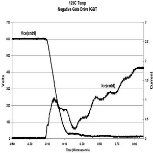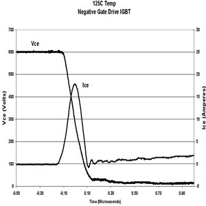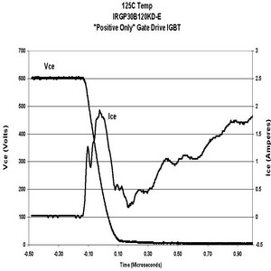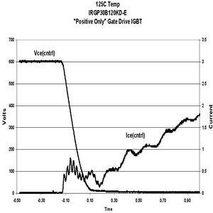 在相同的測試條件下,當(dāng)柵電壓是在0V或單正向柵驅(qū)動情況下,IRGP30B120KD的電路性能顯示dV/dt感生開通電流減小比例為21:1。如果IGBT采用這種方式驅(qū)動,電流很小,對功耗的影響幾乎可以忽略。