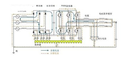 圖2 pwm變頻驅動電機系統(tǒng)的電磁干擾電流流通路徑圖[page]