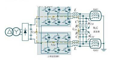差模干擾則主要是由于功率半導體開關器件開關引起的di/dt經(jīng)輸入輸出線間的導體傳播。當然,這些只是傳導干擾產(chǎn)生的最本質原因,而不同的電機系統(tǒng)其傳導干擾的具體成因不同,另外,共模干擾和差干騷擾是可以相互轉化的,并不是絕對分開的。比如圖1所示為共模電流傳輸通道的不平衡造成非本質差模噪聲的電路圖。