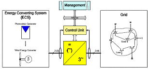 今天,DERs和RESs所使用的逆變器仍然主要采用了被動(dòng)控制技術(shù)。這意味著對(duì)電網(wǎng)接入功率的控制與通過一次能源產(chǎn)生電能的能量轉(zhuǎn)換系統(tǒng)密切相關(guān)。對(duì)電網(wǎng)側(cè)來說,它們相當(dāng)于負(fù)的負(fù)載。它們將從ECS處獲得的全部功率注入電網(wǎng)。在這種方式下,電網(wǎng)側(cè)的電網(wǎng)控制整合,甚至于主動(dòng)參與控制和穩(wěn)定電網(wǎng)狀態(tài)變量都是不可能的。
