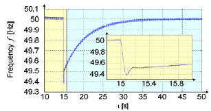由于15s加入了階躍負(fù)載,頻率的降落由下垂控制功能決定。當(dāng)一次控制迅速穩(wěn)定頻率后,二次控制相對(duì)緩慢的將頻率調(diào)回50Hz。
