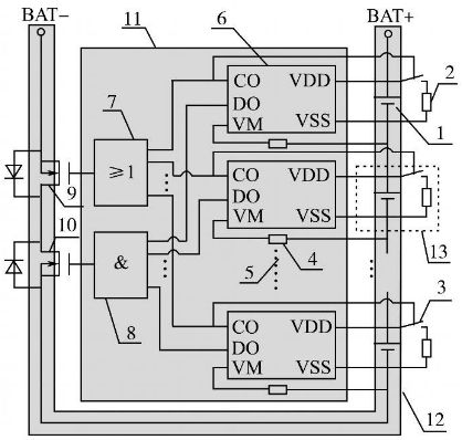 采用單節(jié)鋰電池保護(hù)芯片設(shè)計(jì)的具備均衡充電能力的鋰電池組保護(hù)板示意圖如圖1所示。其中:1為單節(jié)鋰離子電池;2為充電過電壓分流放電支路電阻;3為分流放電支路控制用開關(guān)器件;4為過流檢測(cè)保護(hù)電阻;5為省略的鋰電池保護(hù)芯片及電路連接部分;6為單節(jié)鋰電池保護(hù)芯片(一般包括充電控制引腳CO,放電控制引腳DO,放電過電流及短路檢測(cè)引腳VM,電池正端VDD,電池負(fù)端VSS等);7為充電過電壓保護(hù)信號(hào)經(jīng)光耦隔離后形成并聯(lián)關(guān)系驅(qū)動(dòng)主電路中充電控制用MOS管柵極;8為放電欠電壓、過流、短路保護(hù)信號(hào)經(jīng)光耦隔離后形成串聯(lián)關(guān)系驅(qū)動(dòng)主電路中放電控制用MOS管柵極;9為充電控制開關(guān)器件;10為放電控制開關(guān)器件;11為控制電路;12為主電路;13為分流放電支路。單節(jié)鋰電池保護(hù)芯片數(shù)目依據(jù)鋰電池組電池?cái)?shù)目確定,串聯(lián)使用,分別對(duì)所對(duì)應(yīng)單節(jié)鋰電池的充放電、過流、短路狀態(tài)進(jìn)行保護(hù)。該系統(tǒng)在充電保護(hù)的同時(shí),通過保護(hù)芯片控制分流放電支路開關(guān)器件的通斷實(shí)現(xiàn)均衡充電,該方案有別于傳統(tǒng)的在充電器端實(shí)現(xiàn)均衡充電的做法,降低了鋰電池組充電器設(shè)計(jì)應(yīng)用的成本。