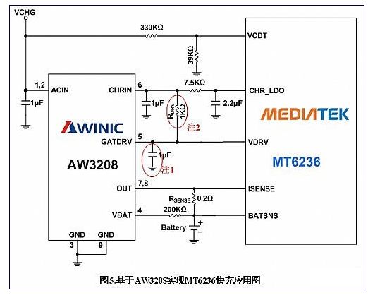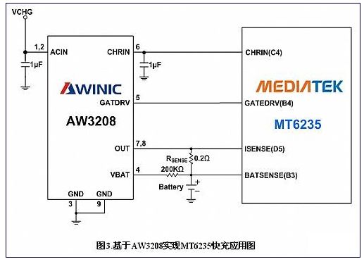 上海艾為電子專門針對MT6235/36平臺推出的AW3208在增加OVP功能的同時,提供了智能充電功能,以滿足快速充電的功能。如圖2所示,AW3208內置專有的K-ChargeTM技術,可根據(jù)芯片溫度智能調整輸出電流,以保證在充電期間整個充電系統(tǒng)的安全。使得手機在實現(xiàn)快速充電的時候不會因為由于環(huán)境溫度較高或者充電電流過大導致芯片進入過溫保護使得充電沒法正常進行。圖3為在MT6235上的典型應用圖。