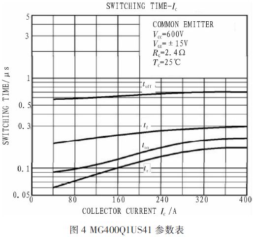 功率開關(guān)管IGBT采用高速型MG400Q1US41,其參數(shù)為1 200V/400A,其參數(shù)如圖4所示。工程中采用十管串聯(lián)的方法以適應(yīng)高電壓的要求。驅(qū)動(dòng)模塊采用M57962L,其參數(shù)為1 200 V/400 A。