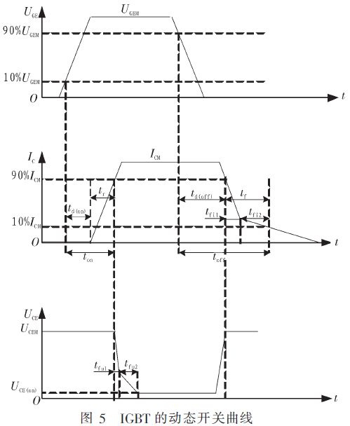 根據(jù)調(diào)制器的要求,由單片機(jī)輸出一定重復(fù)頻率的觸發(fā)脈沖經(jīng)接口保護(hù)電路轉(zhuǎn)換后驅(qū)動(dòng)IGBT的柵極。IGBT在柵極有驅(qū)動(dòng)時(shí)接通,無(wú)驅(qū)動(dòng)時(shí)關(guān)斷,實(shí)現(xiàn)了可控的開關(guān)功能。IGBT的動(dòng)態(tài)開關(guān)曲線如圖5所示。