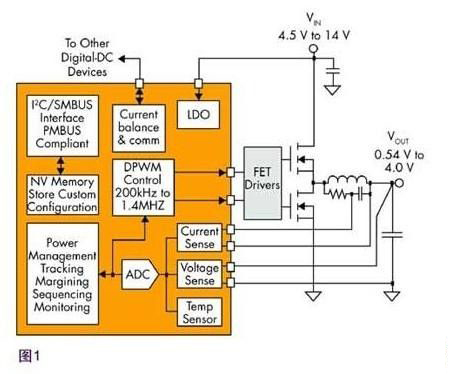 一個(gè)應(yīng)用建議是把DC-DC轉(zhuǎn)換器盡可能靠近負(fù)載放置。這樣做可以把EMI降至最低、減小寬的大電流線(xiàn)跡所占用的板空間,并改進(jìn)轉(zhuǎn)換器的動(dòng)態(tài)特性。“分布式”功率管理系統(tǒng)應(yīng)運(yùn)而生,在這種系統(tǒng)中,所有轉(zhuǎn)換器都理想地彼此相連。能夠與其它轉(zhuǎn)換器在網(wǎng)絡(luò)中協(xié)同工作的一個(gè)控制器例子是FD2004,如圖1的模塊示意圖所示。