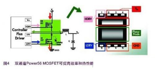 1.帶驅(qū)動(dòng)器和MOSFET的分立式解決方案現(xiàn)在仍在普遍使用。為滿(mǎn)足所有設(shè)計(jì)要求,現(xiàn)在飛兆半導(dǎo)體提供的采用小尺寸熱性能增強(qiáng)型MLP(QFN)封裝的產(chǎn)品,可獲得高系統(tǒng)性能。MOSFET實(shí)現(xiàn)了首先采用MLP封裝(見(jiàn)圖3所示)。其Power56和Power33產(chǎn)品系列采用最新的PowerTrench技術(shù),能夠同時(shí)提供超低RDSon和低Qg,從而適用于高開(kāi)關(guān)頻率應(yīng)用。鍵合技術(shù)可減小封裝的電感,提高封裝有限的ID,適用于大電流應(yīng)用。其低端FET產(chǎn)品組合采用SyncFET集成了肖特基二極管,在實(shí)現(xiàn)高開(kāi)關(guān)性能的同時(shí)降低了熱耗。