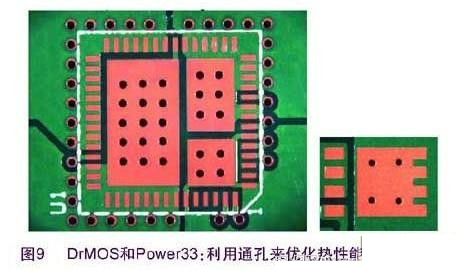 至于版圖布局,金屬較多顯然很有助益。更厚的頂層有助于降低溫度,不過(guò)也許對(duì)PCB的其余部分并不適合,因?yàn)槌杀驹黾恿?,其它元件需要的更精?xì)的間距也不可能實(shí)現(xiàn)。更大的銅面積很有用,但又會(huì)消耗PCB空間。這些應(yīng)該盡可能由焊料覆蓋,因?yàn)榻饘俦砻姹韧科岜砻娴纳嵝愿谩T诙鄬覲CB中,有時(shí)利用內(nèi)層來(lái)協(xié)助散熱。熱通孔(填充焊料)有時(shí)可用來(lái)把熱量擴(kuò)散到PCB的另一面去(圖9)。