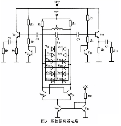 壓控振蕩器按構(gòu)成原理可分為反饋型振蕩器和負阻型振蕩器2大類。這里采用負阻型振蕩器,其主要是由負阻器件和諧振回路組成的振蕩器,利用負阻器件的負電阻效應(yīng)與諧振回路中的損耗正電阻相抵消,維持諧振回路的穩(wěn)定振蕩。圖3為壓控振蕩器電路。
