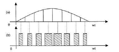 在采樣控制理論中有一個(gè)重要的結(jié)論:沖量相等而形狀不同的窄脈沖加在具有慣性的環(huán)節(jié)上,其效果基本相同。沖量指窄脈沖的面積。效果基本相同指環(huán)節(jié)的輸出響應(yīng)波形基本相同。如把各輸出波形用傅氏變換分析,則其低頻特性非常接近,僅在高頻段略有差異。這一結(jié)論是PWM控制的重要理論基礎(chǔ)。如圖1(a)所示,將正弦半波看成由N 個(gè)彼此相聯(lián)的脈沖組成的波形。這些脈沖寬度相等,但幅度不等,且脈沖的頂部為曲線,各脈沖的幅值按正弦規(guī)律變化。如果將上述脈沖序列用同樣數(shù)量的等幅不等寬的矩形脈沖序列代替,使矩形脈沖的中點(diǎn)和相應(yīng)正弦波部分的中點(diǎn)重合,且使矩形脈沖和相應(yīng)的正弦波部分面積相等,就得到圖1(b)所示的脈沖序列。像這種脈沖寬度按正弦規(guī)律變化而和正弦波等效的波形即為SPWM波形。