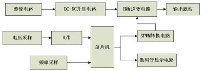 本設(shè)計(jì)包括單片機(jī)最小系統(tǒng)、整流及電源電路、DC-DC 升壓電路、SPWM 轉(zhuǎn)換電路、H 橋逆變電路等幾個(gè)模塊,由于系統(tǒng)需要完成輸出電壓和頻率的檢測(cè)和顯示,因此需要設(shè)計(jì)電壓、頻率采樣電路、A/D 轉(zhuǎn)換電路、數(shù)碼管顯示電路等。系統(tǒng)的總體設(shè)計(jì)框圖如圖3 所示。