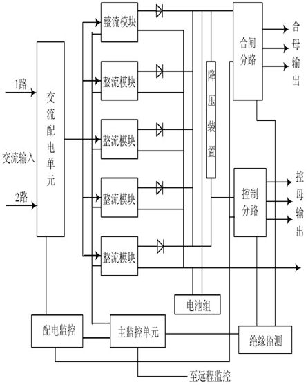 智能高頻開關(guān)電源系統(tǒng)的總體結(jié)構(gòu)主要由主監(jiān)控單元、配電模塊、交流配電單元、整流模塊等組成, 系統(tǒng)總體的結(jié)構(gòu)圖如圖1 所示。系統(tǒng)中的各個監(jiān)控單元受主監(jiān)控單元的管理和控制, 通過通信線將各個監(jiān)控單元采集的信息送給主監(jiān)控統(tǒng)一管理。主監(jiān)控顯示直流系統(tǒng)各種信息, 用戶也可以觸摸顯示屏查詢信息及操作,系統(tǒng)信息還可以接入到遠(yuǎn)程監(jiān)控系統(tǒng)中。系統(tǒng)除了交流監(jiān)控、直流監(jiān)控、開關(guān)量監(jiān)控等基礎(chǔ)單位外, 還配置了絕緣監(jiān)測、降壓裝置、電池巡檢等功能單元, 以達(dá)到對直流系統(tǒng)進(jìn)行全面監(jiān)控的目的。