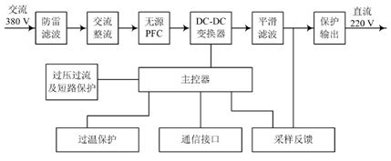 本文設(shè)計的整流模塊的工作原理框圖如圖2 所示,工作時, 模塊首先通過過防雷處理和濾波對輸入的三相交流進(jìn)行處理, 這樣才能保證模塊后級電路的安全; 經(jīng)過處理后的三相交流經(jīng)過整流和無源PFC 后轉(zhuǎn)換成高壓直流時, 這時轉(zhuǎn)換的高壓直流要經(jīng)過DC/ DC 變換器再次轉(zhuǎn)換成可變的直流電壓輸出; 另外模塊控制部分還有負(fù)責(zé)過壓、過流以及短路保護(hù)等作用, 這樣才能保證輸出電壓的穩(wěn)定, 也同時能對模塊各部件進(jìn)行保護(hù)。模塊還在遠(yuǎn)程監(jiān)控中提供了 四遙 ( 遙控、遙調(diào)、遙測、遙信) 接口。