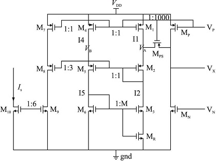 當VP 為低電平時, MP 導通, MPS作開關也導通,并且可以看作近似短路, 進而流過MPS的電流也可以忽略, 因此MP、M1 的VDS近似相同, 流過MP 的電流被鏡像復制至M1。MP 與M1 的W/L成比例, 且比例系數(shù)較大, 因此檢測到的電流與MP 中的電流成比例, 同時遠小于MP 中的電流。