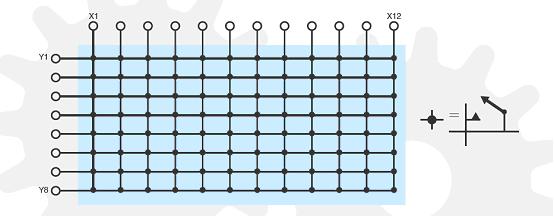 實(shí)現(xiàn)開關(guān)切換的一個比較通用的方法就是采用交叉點(diǎn)開關(guān)或矩陣排列來實(shí)現(xiàn)。在矩陣開關(guān)中,一系列的橫向(X軸方向)和縱向(Y軸方向)線路在每個交叉點(diǎn)上相互連接著。開關(guān)最簡單的結(jié)構(gòu)是,在通常的狀態(tài)下是常開的,而在上電后則斷開連接,形成閉合狀態(tài),但是,也可能存在其他的結(jié)構(gòu)。開關(guān)允許矩陣中任何橫向線路與縱向線路在任意點(diǎn)的連接。