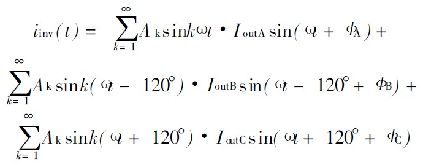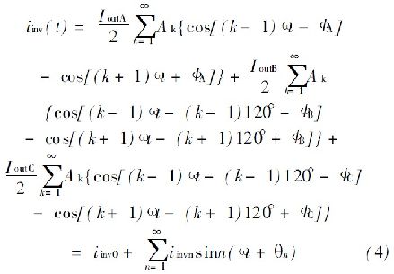 式中, I inv0是直流分量的逆變器輸入電流; I invn 是n 階部分的電流。通過公式( 4) 可看到, I outA = I outB = I outC和ΦA= ΦB= ΦC , 同時(shí)有I invn = 0, 如果n> 0 三相負(fù)載電流是平衡的。否則, 交流成分存在會造成連鎖反應(yīng)。
