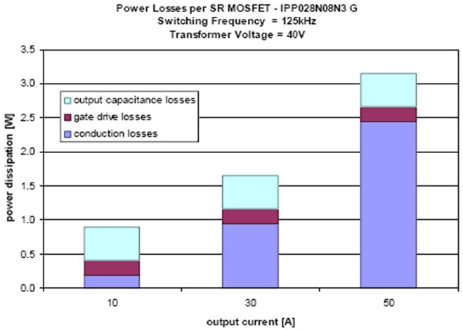 要優(yōu)化SR MOSFET的效率,必須找到開關(guān)損耗與導(dǎo)通損耗之間的最佳平衡點(diǎn)。在輕負(fù)載條件下,RDS(on)導(dǎo)通損耗占總功耗的比例極低。在這種情況下,在整個(gè)負(fù)載范圍內(nèi)基本保持不變的開關(guān)損耗是主要損耗。但是,當(dāng)輸出電流較高時(shí),導(dǎo)通損耗則成為最主要的損耗,其占總功耗的比例也最高,請參見圖2。