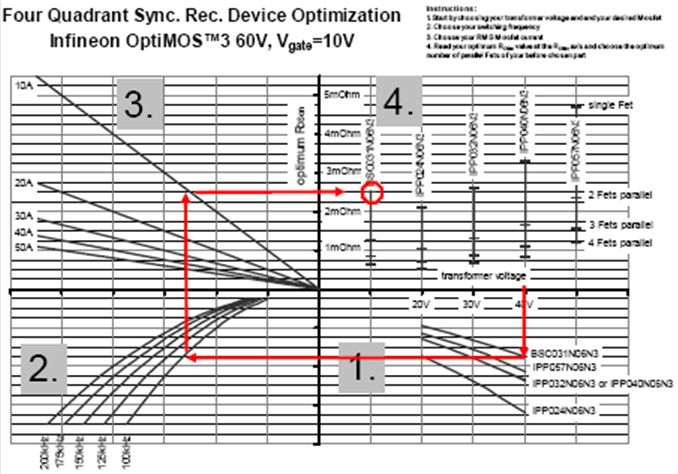 為了幫助開發(fā)人員更輕松地為SR應(yīng)用選擇最優(yōu)MOSFET,下面介紹一個(gè)四象限SR器件優(yōu)化表。借助這個(gè)優(yōu)化表,可以根據(jù)三個(gè)應(yīng)用參數(shù)找到最適合的器件:次級變壓器電壓、開關(guān)頻率和RMS MOSFET電流。為便于理解,圖5給出了一個(gè)實(shí)際的例子。