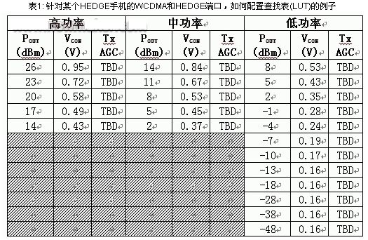 表1所示為針對某個HEDGE手機的WCDMA和HEDGE端口,如何配置查找表(LUT)的例子。該表格針對Avago的3G功率放大器,分為高、中和低功率模式三個主要部分。其它功率放大器因結(jié)構(gòu)不同而具有不同的設(shè)置。高、中和低功率模式分區(qū)下各列內(nèi)容為該模式下的輸出功率及其相應(yīng)的VCON 電壓,這些電壓是基帶處理器生成的電壓,通知FAN5904為功率放大器提供正確的輸出電壓,獲得特定的輸出功率。GSM和EDGE則需要不同的查找表。