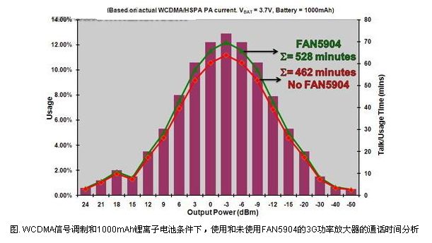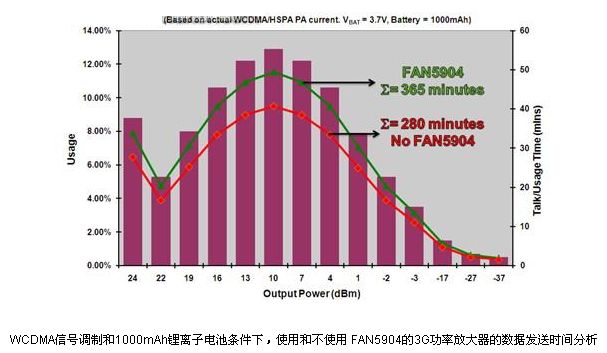 圖1和圖2顯示了在不同輸出功率條件下一個3G PA分別在語音和數(shù)據(jù)傳輸模式下有、無FAN5904時所使用的工作時間的分析。在PA電源電壓設(shè)定在鄰近信道功率比(ACPR)為-39dBc時的值時, WCDMA的ACPR可以改善到-43dBc,但是電流消耗將會增加,導(dǎo)致效率降低。