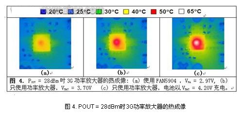 一個時常被忽視,但經(jīng)常遭到抱怨的參數(shù)是耗熱問題。在手持電話貼近頭部進(jìn)行通話,使用手機網(wǎng)上沖浪或者玩在線網(wǎng)絡(luò)游戲時手機發(fā)熱,大多數(shù)用戶會因此而感到煩惱。問題的關(guān)鍵在于,設(shè)計人員在設(shè)計手機時必需將這一因素考慮在內(nèi)。圖4所示為某3G功率放大器的熱成像,其中,(a)為使用FAN5904來供電;(b)為直接與電池連接;(c)為電池以4.2V電壓充電。使用FAN5904時,在滿輸出功率情況下,功率放大器的溫度幾乎不可能達(dá)到50?C,在(b)和(c)的情況下,溫度很容易達(dá)到50?C和65?C,使用一段時間后,手機會很快發(fā)熱。在數(shù)據(jù)卡應(yīng)用中,尤其是3G USB調(diào)制解調(diào)器卡開始流行,熱耗散,或者說實現(xiàn)熱耗散最小化變得十分重要。USB卡不能像手機那樣有效地散熱,因為它的體積非常小。由于3G調(diào)制解調(diào)器主要用于數(shù)據(jù),功率放大器在大部分時間運行于“發(fā)熱”狀態(tài)。減少這種熱量的最有效方式是使用諸如FAN5904的降壓轉(zhuǎn)換器。
