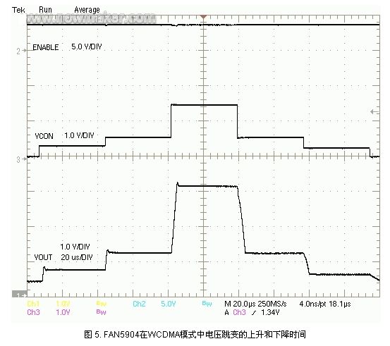 另一個常常被遺忘的參數(shù)是瞬態(tài)響應(yīng)時間。當(dāng)需要在不同電壓之間進(jìn)行跳變,以便為功率放大器提供合適的輸出功率時,對各種無線協(xié)議而言,瞬態(tài)響應(yīng)時間變得尤為重要。FAN5904以6MHz的頻率進(jìn)行切換時,具有非常短的10?s響應(yīng)時間 (如圖5所示),完全滿足時隙間隔為25?s的WCDMA規(guī)范和IOPC 6.4.2規(guī)范要求。