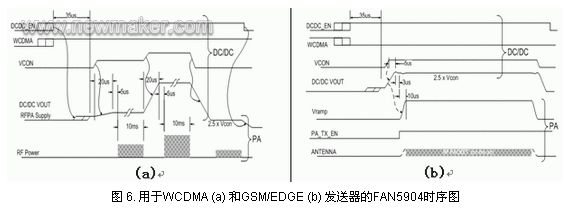 在輸出功率需要從低水平變到高水平,或者從啟動開始,瞬態(tài)響應(yīng)時間為10?s。對于降壓穩(wěn)壓器而言,關(guān)鍵是使功率放大器滿足這些規(guī)范要求,避免出現(xiàn)通話中斷或者通話語音質(zhì)量不良的情況。由于用戶在不同的區(qū)域移動,信號覆蓋情況或好或壞,雖然如此,通話中斷現(xiàn)象是用戶所不能容忍的。對于GSM/EDGE模式,F(xiàn)AN5904能夠在5?s內(nèi)完成電壓之間的跳變,滿足GSM規(guī)范。圖6所示為用于WCDMA和GSM /EDGE發(fā)送器的FAN5904時序圖。
