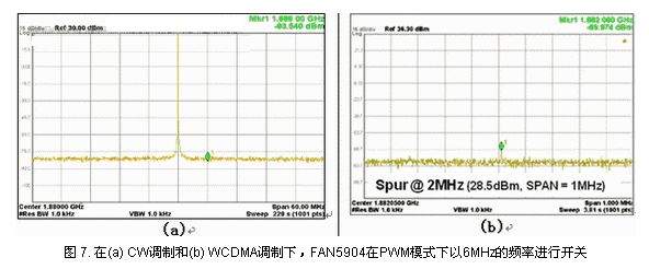 在使用降壓轉(zhuǎn)換器時,我們關(guān)心的是開關(guān)頻率如何影響RF性能,RF工程師極不愿意添加一個會對RF信號保真度(發(fā)送和接收兩個方面)造成潛在影響的器件。如前所述,F(xiàn)AN5904采用PWM或PFM模式工作,分析顯示,兩者均不會對RF性能造成影響。圖7(a)所示為28.5dBm信號的發(fā)送CW(關(guān)閉調(diào)制以顯示接近中心的尖刺),以及距右側(cè)6MHz的標(biāo)記1。FAN5904產(chǎn)生的假性音調(diào)(spurious tones)水平很低,使得尖刺低于噪聲本底。圖7(b)所示為開啟調(diào)制時的尖刺水平。這種尖刺很小,遠(yuǎn)遠(yuǎn)低于Tx遮蔽水平。FAN5904具有6MHz 開關(guān)頻率的一個優(yōu)勢在于該頻率遠(yuǎn)離信號頻率,并且位于5MHz的帶寬之外,轉(zhuǎn)換成位于WCDMA信號兩側(cè)的2.5MHz頻率。