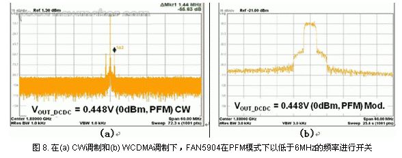 或許在PFM模式下,我們更加關(guān)注的是尖刺會在哪里進(jìn)入信號調(diào)制。通過進(jìn)一步查看圖8(a),在CW模式中,尖刺仍然在-40dBc以下,在8 (b)中,更重要的是該尖刺處于WCDMA調(diào)制遮蔽之下。