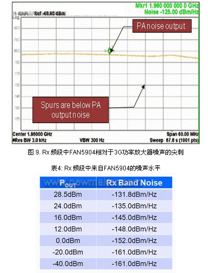 為了進(jìn)一步了解降壓轉(zhuǎn)換器帶來的噪聲/尖刺情況,根據(jù)3G功率放大器自身的噪聲輸出,對接收頻段內(nèi)的噪聲進(jìn)行了測量和比較。圖9顯示在28.5dBm的最高輸出功率下,來自FAN5904的尖刺水平實際上遠(yuǎn)遠(yuǎn)低于功率放大器的噪聲水平,表4顯示,來自FAN5904 的噪聲在-131.8dBm/Hz處最大,但仍然遠(yuǎn)遠(yuǎn)低于功率放大器自身的-90dBc。RF工程師可以放心,F(xiàn)AN5904在PWM和PFM模式工作時不會對蜂窩和其它RF頻譜的發(fā)送和接收頻段造成干擾。