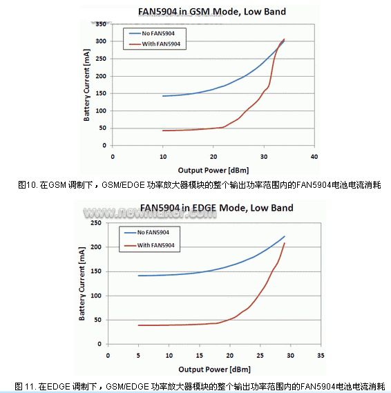 最后一個重要特性是,F(xiàn)AN5904控制GSM/EDGE功率放大器模塊的能力在于將RF功率管理解決方案從 FAN5904分離出來。在GSM/EDGE模式下,F(xiàn)AN5904具有3A的設(shè)計峰值極限電流,因而能夠控制電流高達(dá)2A的功率放大器模塊。在GSM /EDGE模式下,由于電流負(fù)載更大,F(xiàn)AN5904總是以PWM方式工作,因為GSM和EDGE信號較3G信號具有更高的輸出功率水平,因此它以 3MHz的頻率進(jìn)行開關(guān)。3MHz是合適的開關(guān)頻率,因為它位于WCDMA通道帶寬之外,但是仍然可以使用小電感和小電容來處理更大電流負(fù)載,并使效率維持在高達(dá)95%的水平。人們可能要問,為什么在該模式下不使用6MHz,這在設(shè)計上是不可行的,因為較大的電流負(fù)載會使開關(guān)損耗更高,小型化解決方案帶來的好處在效率方面得不到補償。圖10和圖11顯示,在蜂窩設(shè)備處于GSM或EDGE模式下,使用FAN5904可將電流降低100mA。