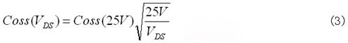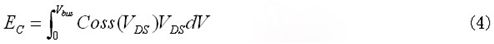 如果依據(jù)漏源電壓變化的輸出電容值可得,則輸出電容儲能可用公式(4)求出。雖然電容曲線顯示在數(shù)據(jù)表中,但要想從圖表中精確讀出電容值并不容易。因此,依據(jù)漏源電壓變化的輸出電容儲能將由最新功率MOSFET數(shù)據(jù)表中的圖表給出。通過圖3顯示的曲線,使用公式(5)可以得到期望的直流總線電壓下的等效輸出電容。