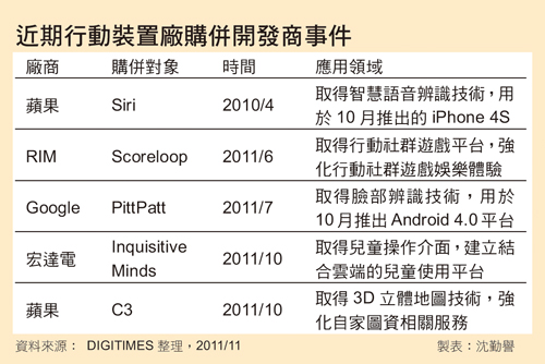 移動(dòng)裝置市場(chǎng)競(jìng)爭(zhēng)激烈,蘋果、Google、宏達(dá)電等大廠為凸顯產(chǎn)品獨(dú)特性,購(gòu)并開發(fā)商成為重要布局。
