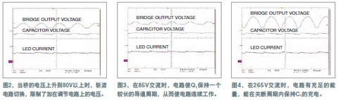示波器軌跡表明仍有足夠的設(shè)計余量,Q1可停留一個更長的周期,此期間C1滿充。當(dāng)輸入電壓跌至54V交流時,通過LED的電流開始下降。
