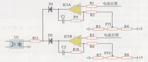 對(duì)于本應(yīng)用中, 只要比較反饋控制電路里的兩個(gè)PI調(diào)節(jié)器( 圖8中IC1A和IC1B) 的輸出端電壓高低, 就能實(shí)現(xiàn)狀態(tài)指示。當(dāng)IC1A輸出電壓高于IC1B輸出電壓時(shí), 電流反饋起作用, 電路處于充電狀態(tài)。反之, 處于浮充狀態(tài)。