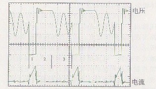 圖5所示的是工作在完全能量轉(zhuǎn)換狀態(tài)下, 開(kāi)關(guān)管Q1上的電壓與電流波形。在這種工作模式下, 每個(gè)開(kāi)關(guān)周期被分為三個(gè)階段( 分別如圖中1、2、3所示) .在階段1, 開(kāi)關(guān)管導(dǎo)通, 變壓器原邊電流沿斜線上升到峰值電流, 并將能量?jī)?chǔ)存在高頻變壓器中。