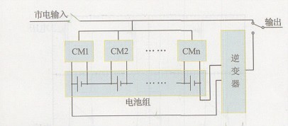 圖2所示是本文提出的一種蓄電池組均衡充電模式結(jié)構(gòu)示意圖, 圖中CM表示充電器或充電模塊。在這種均衡式充電模式中, 對(duì)電池組的每一節(jié)電池都單獨(dú)配置一個(gè)充電模塊, 它是均衡式充電裝置的核心。在應(yīng)急電源中, 當(dāng)處于非應(yīng)急狀態(tài)運(yùn)行時(shí), 應(yīng)急電源的輸出通過(guò)開(kāi)關(guān)直接由市電供給, 這時(shí), 逆變器不工作, 各充電模塊給各節(jié)相應(yīng)的電池進(jìn)行充電或浮充電。當(dāng)應(yīng)急電源處于應(yīng)急工作狀態(tài)時(shí), 由電池組給逆變器供電, 通過(guò)逆變器輸出應(yīng)急逆變交流電源。這時(shí), 由于各充電模塊無(wú)交流輸入, 處于不工作狀態(tài), 不影響蓄電池組的放電工作狀態(tài)。