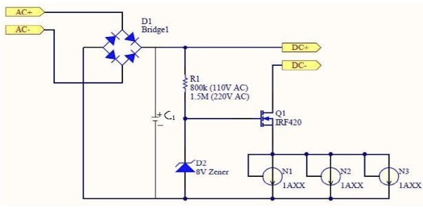 采用恒流二極管作為LED的恒流驅(qū)動具有結(jié)構(gòu)簡單,成本低廉的優(yōu)點(diǎn)。尤其適合于小功率市電LED燈具,如球泡燈和日光燈和吸頂燈。但是由于受到功耗的限制,它只能用于高壓小電流的情況。負(fù)載只能是多個(gè)小功率LED的串聯(lián)或是采用集成的“高壓LED”。而且,如果直接采用交流整流,電容濾波的方案,會有功率因素不高的缺點(diǎn),而必須采用無源功率因素補(bǔ)償?shù)姆桨浮_@些都是在使用時(shí)需要考慮的。
