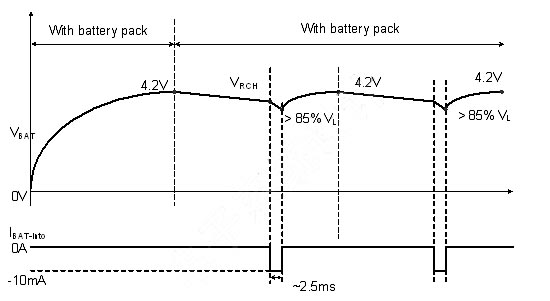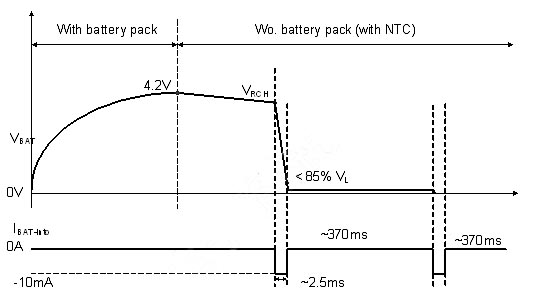 使用者亦有可能在充電或式充電完畢后,在未將電源移除的情況下,即抽離電池的情況。為避免造成危險(xiǎn),IC內(nèi)部應(yīng)具有如圖7, 8的電池存在偵測機(jī)制。充電IC會(huì)以短時(shí)間脈沖(每370ms產(chǎn)生2ms的脈沖)方式抽取電池電流,此時(shí)若電池存在,則偵測到的電池電壓應(yīng)大于一預(yù)設(shè)閥值;若電池已切離,則充電IC偵測到一低電壓,即可判定為電池?cái)嚅_狀態(tài),并將電池端電壓切斷,保護(hù)使用者安全。