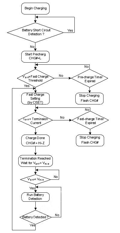 圖6所示為鋰離子電池充電器的標(biāo)準(zhǔn)充電流程,首先充電IC偵測是否有輸出短路或是過載的保護(hù)模式,若系統(tǒng)一切正常接著偵測電池初始電壓是否達(dá)到3V以上,高于3V者就直接以快充模式進(jìn)行高電流充電,若電池低于3V者,進(jìn)入預(yù)充電模式,以快充的10%進(jìn)行充電,喚醒電池并避免電池?fù)p壞。在預(yù)充電階段,仍隨時(shí)偵測電池電壓,達(dá)到3V后可隨即切入快充模式。