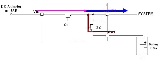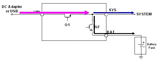 LD6275具有適應(yīng)性電源路徑管理(Adaptable Power Path Management, APPM)功能,其為以供給系統(tǒng)端用電為主,對(duì)電池充電為輔,如圖3所示;當(dāng)系統(tǒng)用電超過輸入電源的供給限制時(shí),其電池亦能主動(dòng)開啟放電功能同時(shí)對(duì)系統(tǒng)端供給其所需之電能需求,如圖4所示。