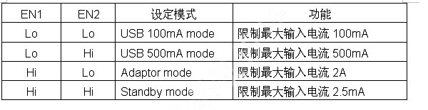 LD6275將電源適配器/USB埠的5V直流電源進(jìn)行降壓穩(wěn)流,對(duì)鋰離子電池進(jìn)行充電,為防止電源適配器的過電流超載,可以外部電阻RCISET設(shè)定最大充電電流限制。同時(shí)支援電腦USB埠充電模式,并依據(jù)外部腳位EN1與EN2進(jìn)行設(shè)定,各模式請(qǐng)見表1.透過為USB 500mA與USB 100mA操作模式設(shè)定,可以保護(hù)PC端USB埠避免過載。