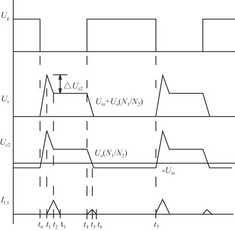 t 5時(shí)刻L 1通過VD1和VD2給輸入電容C 1回饋能量,并給C 2充電到-U IN,到t 6時(shí)刻L 1中能量釋放完畢。