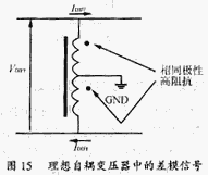 從差模信號看,有中心抽頭的自耦變壓器是兩個在相位上相同的對分繞組,見圖15。這就意味差模電流在其中所形成的磁場,會使其對差模電流呈現(xiàn)高阻抗。相當(dāng)于對差模信號并聯(lián)了一個高阻值的阻抗,它對差模信號的大小沒有影響。